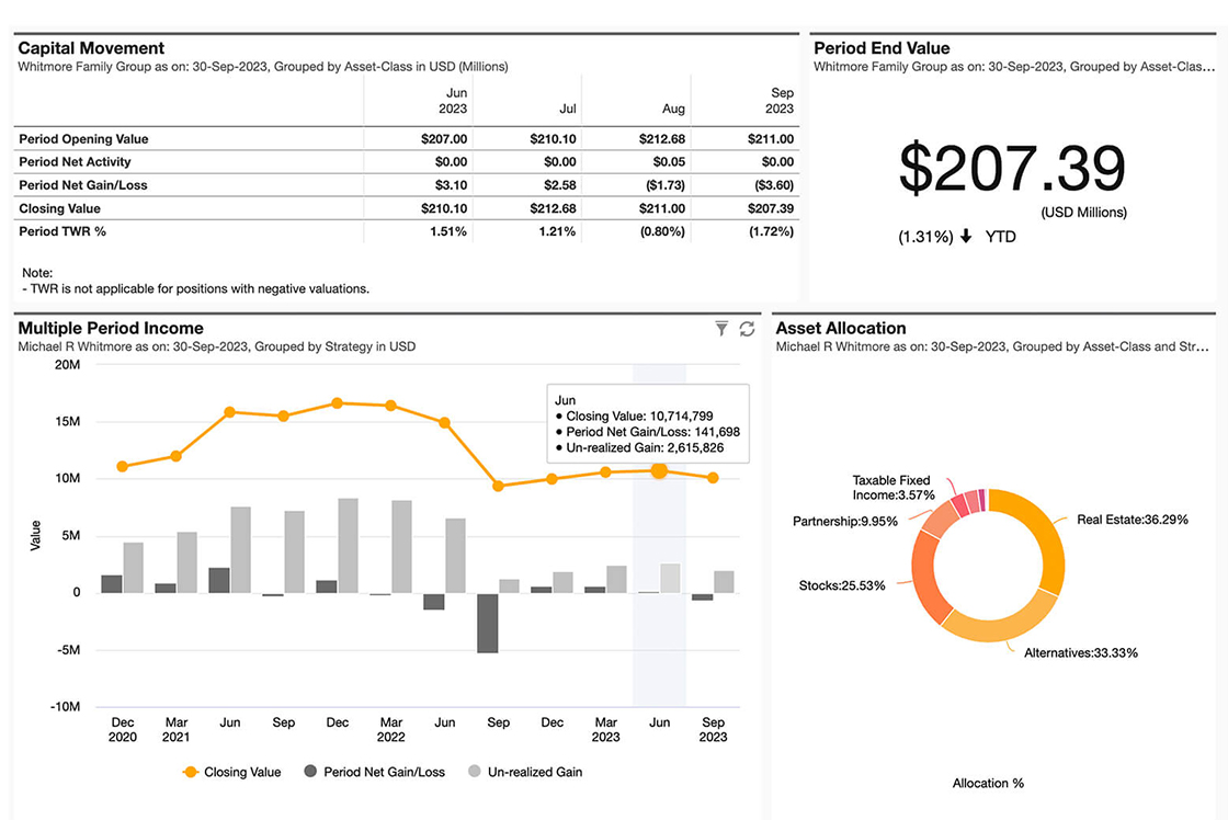 Calculating ROI and tracking investment performance is crucial for the Multi-Family Office professional. As investor demands grow, they want their financial professionals to answer questions about investment performance, risk and benchmark comparisons. Our multi asset class reporting features provide all of these answers and more, directly from the detailed general ledger activity.