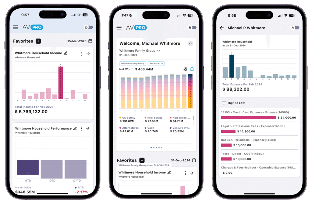 Whether you are making individual investment decisions, outsourcing investments to a third-party manager, or a combination of both, AV’s multi family office software allows you to aggregate data and plug in data feeds, enabling you to report and analyze the consolidated information across asset classes.