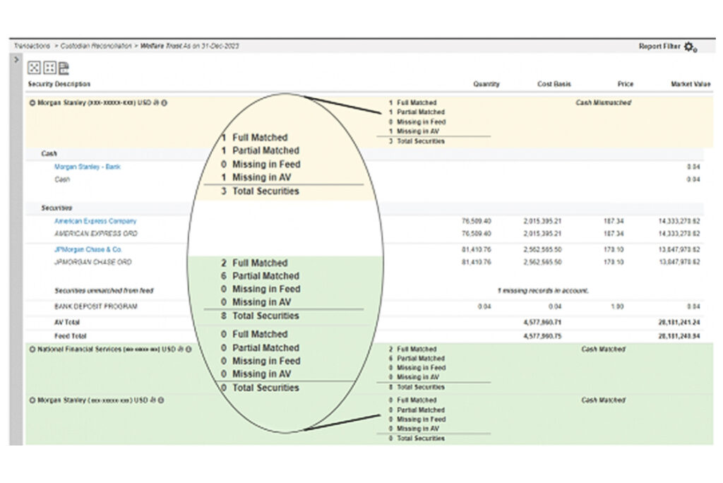 Our direct feed engine interfaces with global partners such as PCR and Electra for custodian transactions, positions and cash feeds and provides easy to use custodian account recon