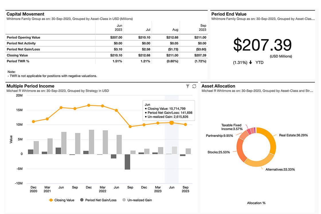 Track your asset allocation and portfolio performance for all asset classes and strategies with their underlying investments across all entities.